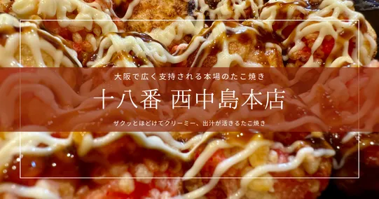 十八番 西中島本店は、大阪市淀川区・西中島エリアにあるたこ焼き専門店です。外はカリッと香ばしく、中はクリーミーなやさしい食感が特徴で、天かすの香ばしさと出汁の旨みが評判です。創業(1990年〈平成2年〉11月26日)から地元客に愛され、観光客も気軽に立ち寄れる一軒として親しまれています。