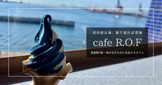 展示を巡って少し疲れたタイミングで現れる cafe R.O.F。大阪湾を眺められるカウンター席、すぐ目の前にタカアシガニが動く深海水槽、そしてジンベエザメやチンアナゴをモチーフにした遊び心あるメニュー。ここでの休憩は、海遊館の楽しい記憶をもうひとつ増やしてくれます。